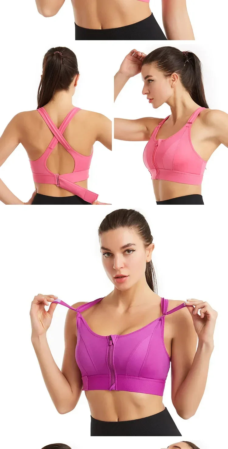 Women Sports Bras Tights Crop Top Yoga Vest Front Zipper Plus Size Adjustable Strap Shockproof Gym Fitness Athletic Brassiere