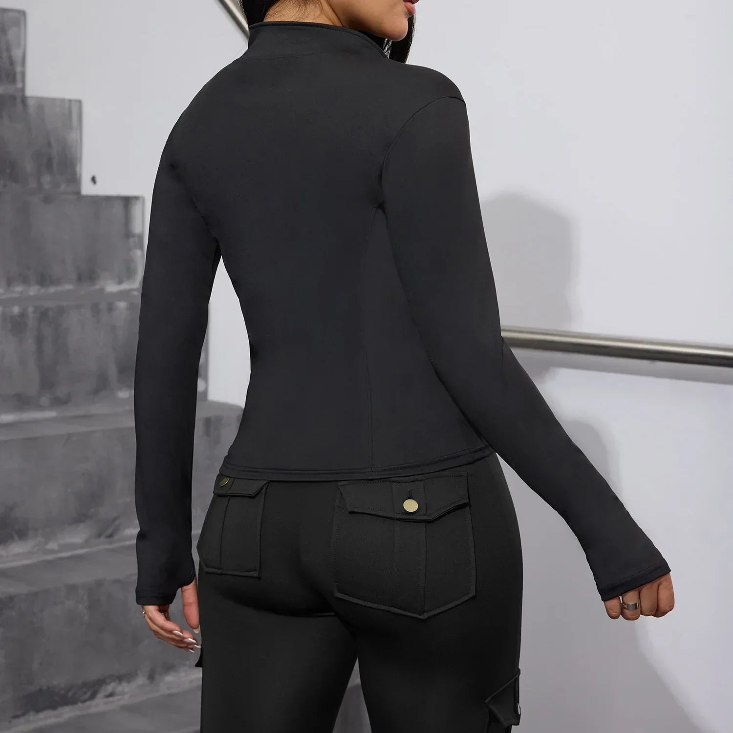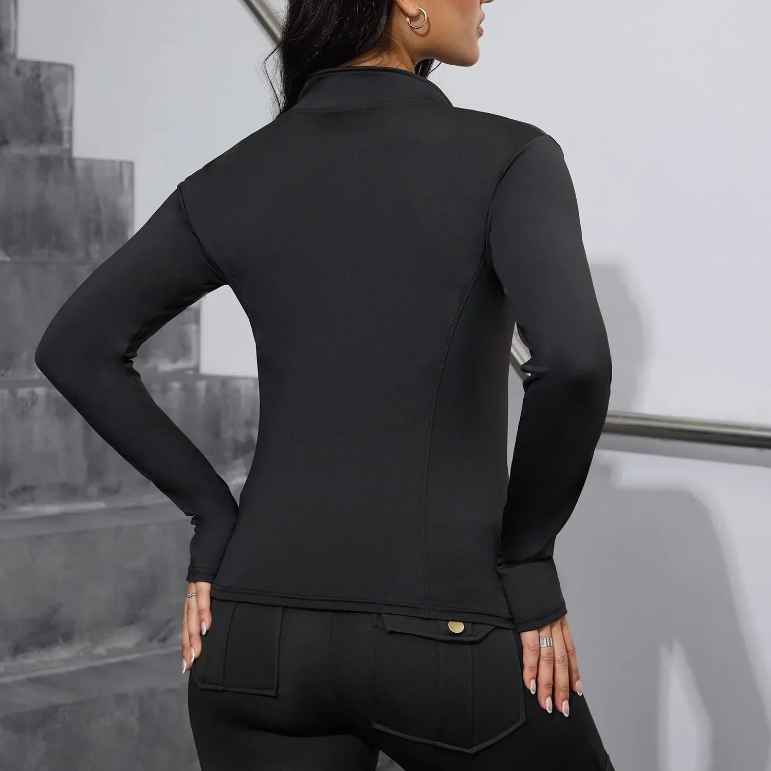 Women's Outdoor Running Fitness Jacket T-shirt Stand Collar Long Sleeve Zipper Yoga Shirts Solid Gym Push Up Workout Tops New